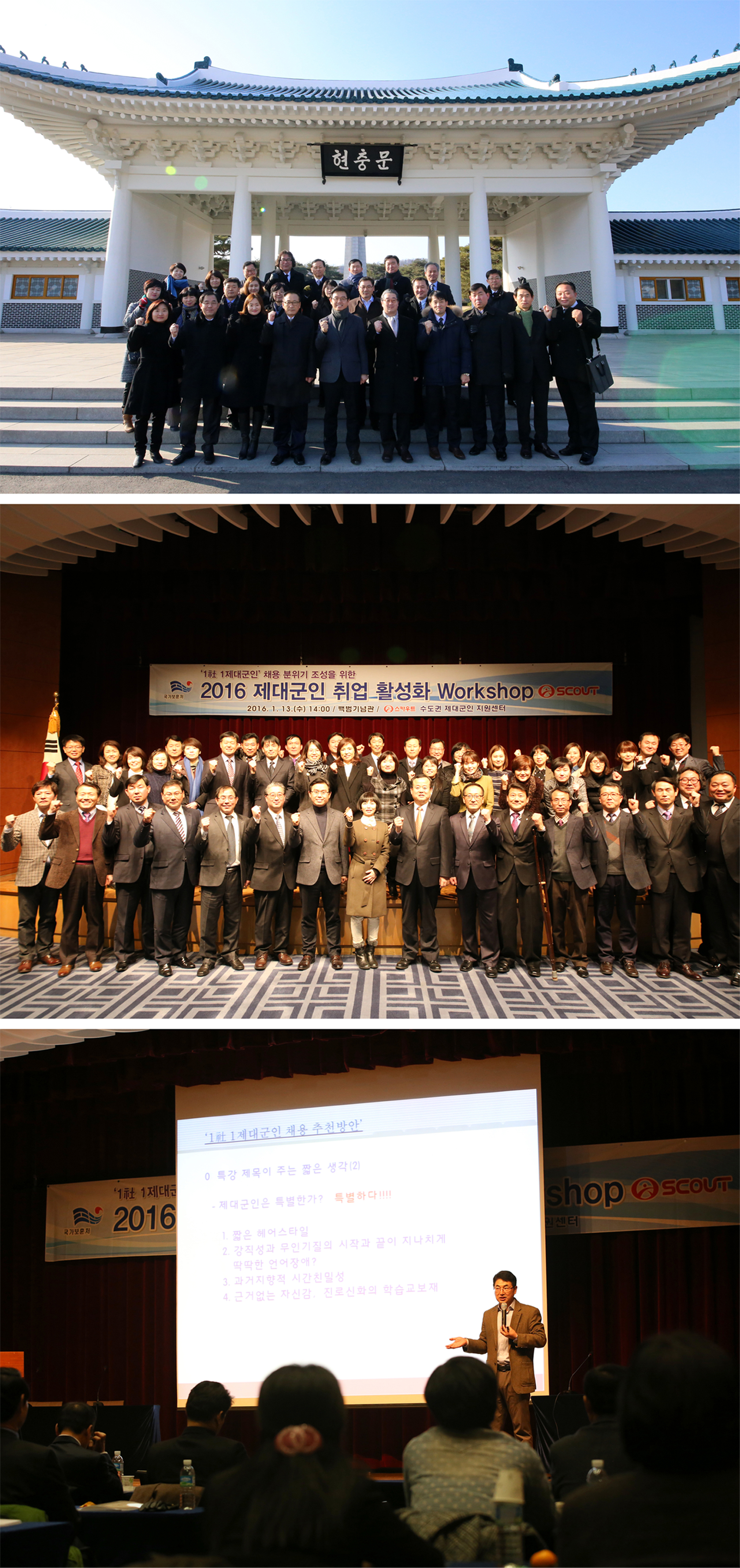 □ 최창익 국가보훈처 제대군인국 취업과장과 문영철 (주)스카우트 대표이사를 비롯한 보훈처 관계관들과 수도권 제대군인지원센터 전 직원이 한자리에 모여 ‘2016 제대군인 취업 활성화’를 주제로 진행된 이번 워크숍은 『제대군인에게 감사 및 ‘1社 1제대군인 채용’ 이라는 사회적 분위기 조성』을 목표로 세미나를 통해 직원들의 업무수행역량 강화로 한 단계 격상된 전직지원을 도모하고자 마련되었다.